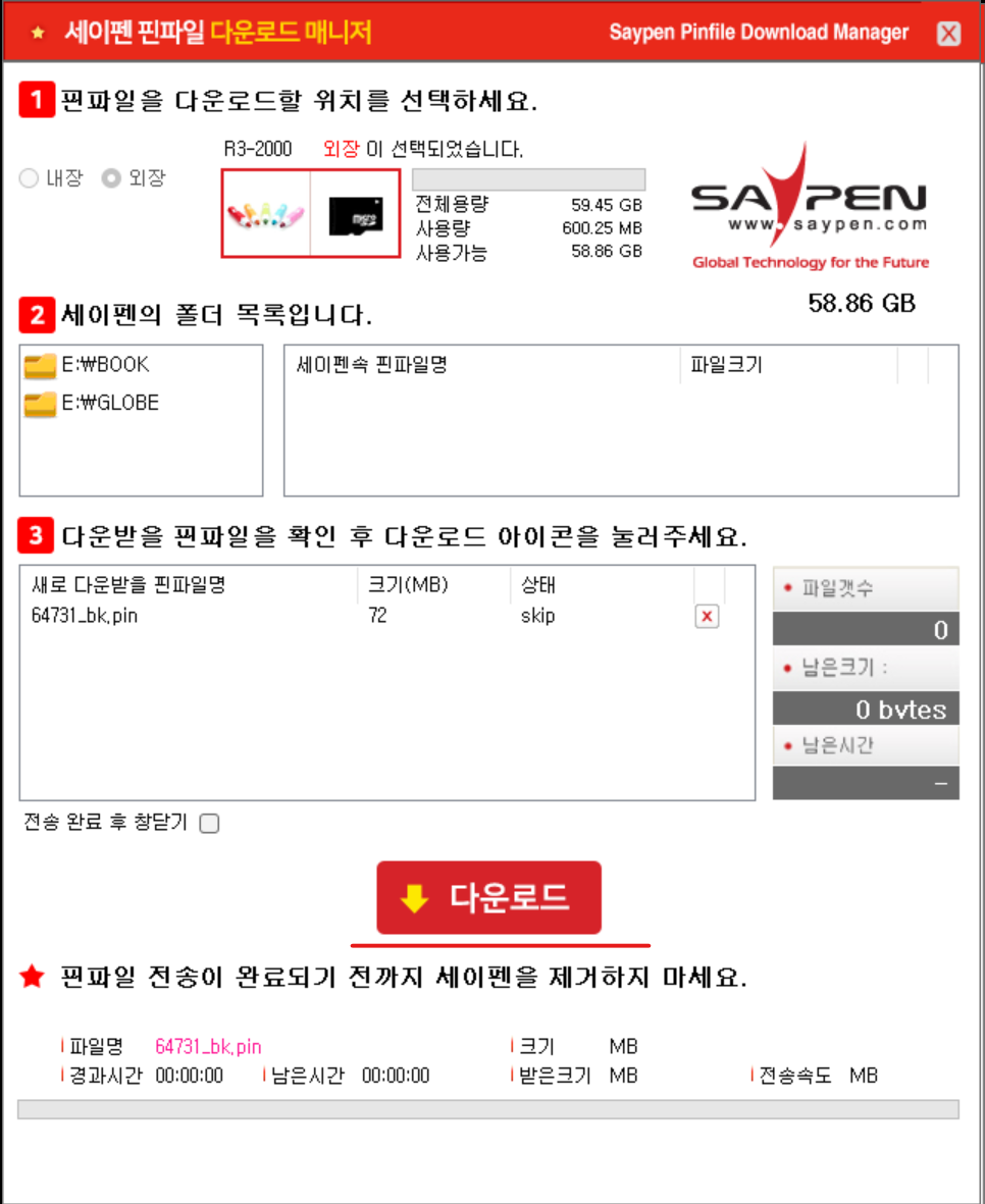 다운로드가 진행되는 동안에는 연결되어 있는 세이펜을 제거하지 않습니다.