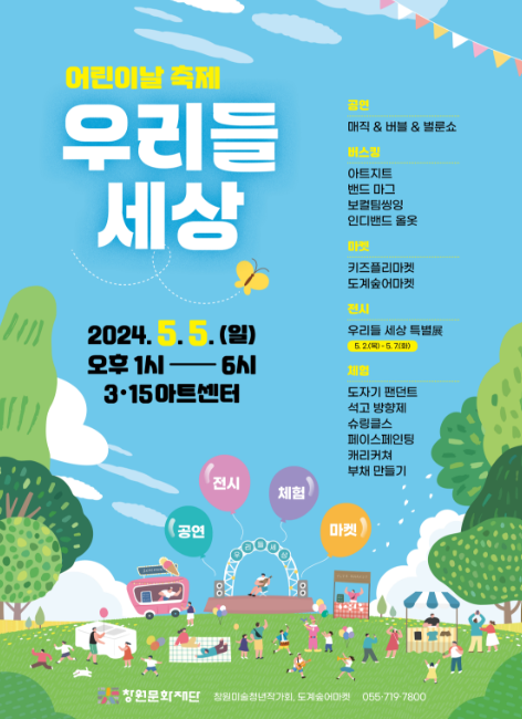 - 내용 : 우리들 세상 특별 전시와 함께 마켓, 체험 프로그램이 준비되어 있습니다. 체험 프로그램에는 도자기, 슈링클스, 석고방향제, 부채 등 다양한 체험 프로그램과 매직&버블&벌룬쇼 공연, 버스킹이 준비되어 있습니다.
