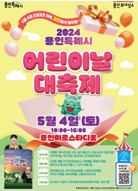 - 내용 : 어린이놀이마당, 민속마당, 지구촌마당, 스포츠마당, 유아마당, 체험마당으로 구성되어 있는 이번 어린이 축제는 총 90여 개의 체험 프로그램을 만날 수 있습니다. 이외에도 어린이합창, 댄스, 트롯 등의 공연도 준비되어 있어 가족과 함께 즐거운 시간을 보낼 수 있습니다. 먹거리 부스를 제외하고 모두 무료로 진행되며 오후 2시 30분부터 경품 이벤트도 있으니 참여해 보시기 바랍니다.